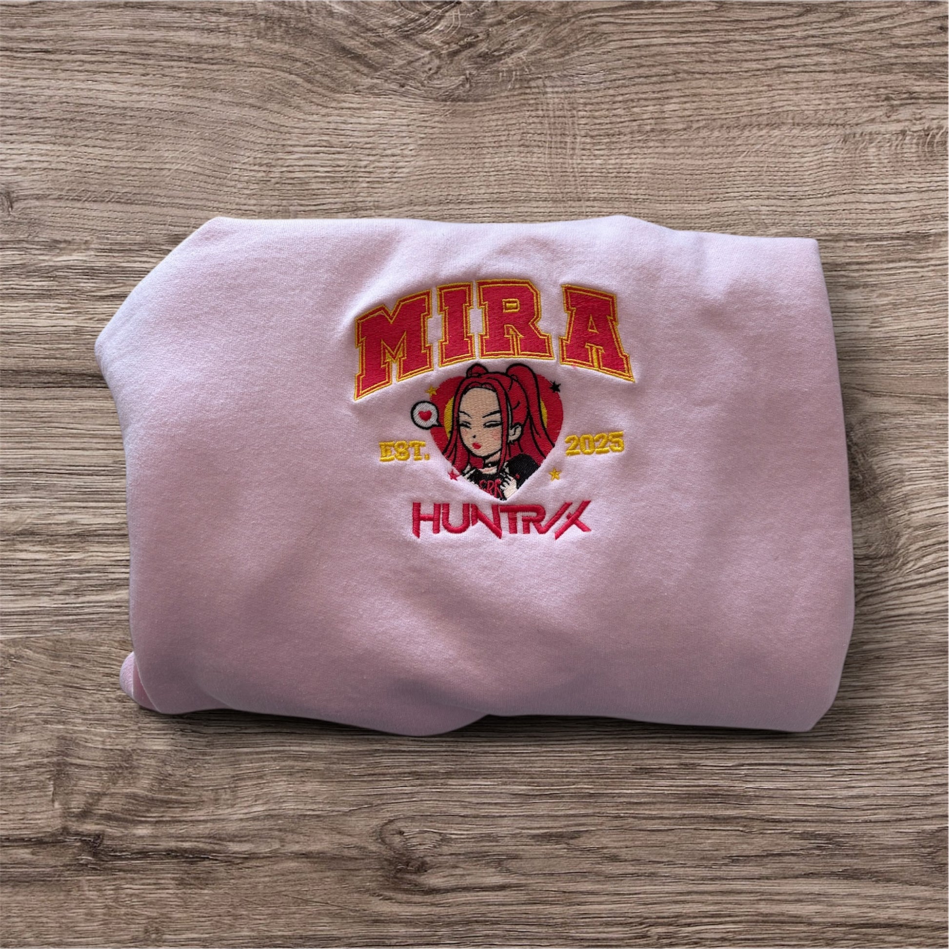 Share your bias for Mira from Huntrix with this pullover hooded sweatshirt embroidered with her name and portrait! Available in pink, black or white - a great wardrobe staple as the weather gets cooler.